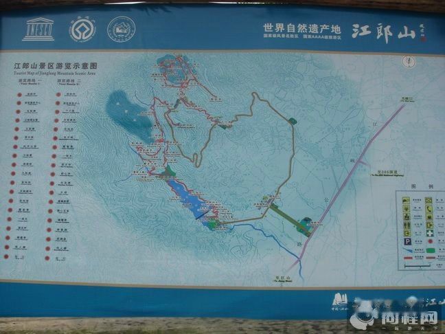上山:观郎坪→天半江郎→徐霞客塑像→游客服务中心(售票处)→检票口→伟人峰观景台→江郎书院→虎跑泉→商业街→开明禅寺→十八曲→会仙岩→百步峡→霞客亭→一线天→登天坪→郎峰天游→天桥→舒心坪→问天亭