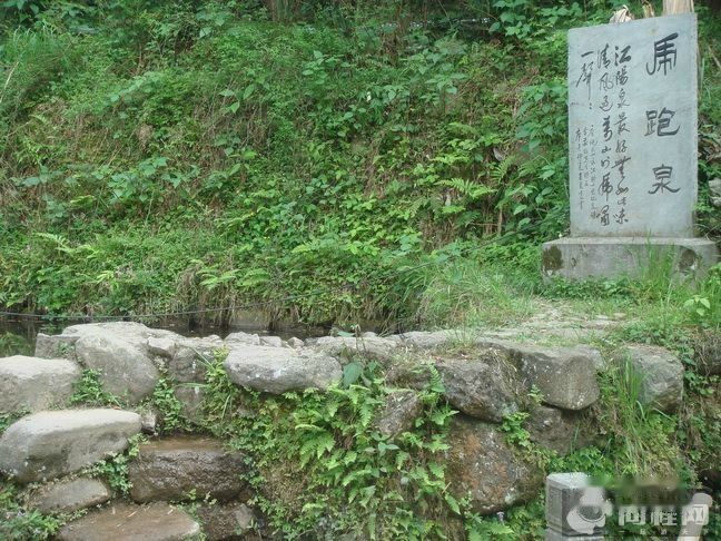 【虎跑泉】:碑刻前一池泉水、一座小桥、一条小溪,池水清冽,游鱼嬉戏