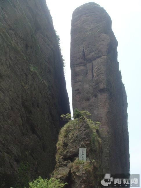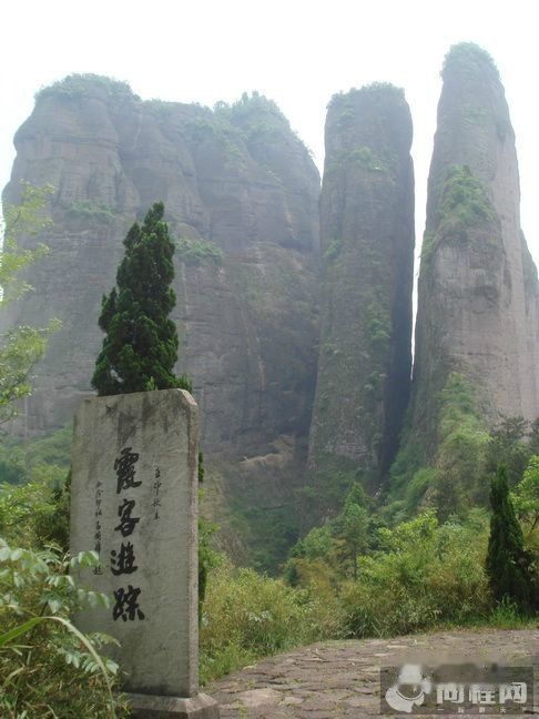 【霞客游踪】:碑刻背面刻有《徐霞客游记》:“悬望东支尽处,其南一峰特耸,摩云插天,势欲飞动。问之,即江郎山也。望而趋,二十里,过石门街,渐趋渐近,忽裂而为二,转而为三。已复半岐其首,根直剖下;迫之则又上锐下敛,若断而复连者,移步换形,与云同幻矣!夫雁宕灵峰、黄山石笋,森立峭拔,已为瑰观,然俱在深谷中,诸峰互相掩映,反失其奇;即缙云鼎湖,穹然独起,势更伟峻,但步虚山即峙于旁,各不相降,远望若与为一,不若此峰特出众山这上,自为变幻,而各尽其奇也!”