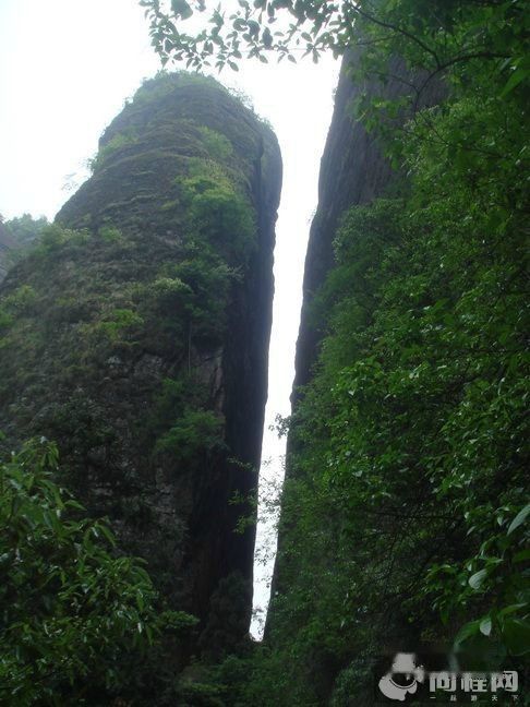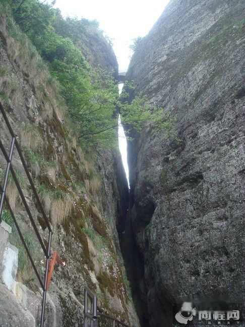 【一线天】:一线天两侧的石壁,左边亚峰的向阳峭壁上怪石裸露、寸草不生,而对面灵峰的背阴峭壁上却是林草茂盛,一派生机,当地人叫它阴阳壁。谁说“阳盛阴衰”,此未必四
