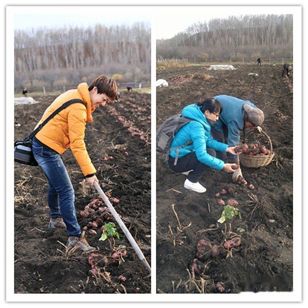 太阳露出了点,慢慢西斜,雪和茔落下了好长一段。快到家了:矮油,隔边一家子在收“红薯”!用拖拉机滴哦,毫不犹豫立马飞奔“红薯”地。叫嚣着“哦耶,我们也来刨红薯╭(╯^╰)╮!!” 大妈一笑,好淡定的一说:土豆!(@!#@#%¥%)!囧rz~~~糗大了!好委曲:木见过红色的土豆哈(^o^)/~。(PS:红色土豆淀粉含量低,脆,合适炒土豆丝;白色土豆淀粉含量高,面,合适做土豆泥。大妈语录)