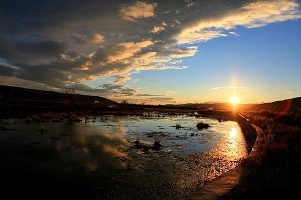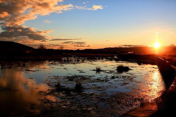 夕阳如血,余辉染红了湿地,整个湿地披了层金装,仿佛是上帝之手给上了浓墨重彩的一笔。
