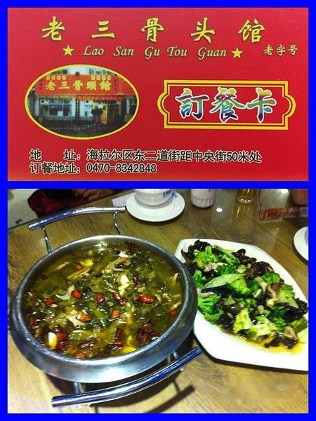 海拉尔推荐“老三骨头馆”,我们去时已经八点多了还得等位。爆棚!味还真不错,由于中午吃太撑还木觉着饿,我们一共点了仨菜,还上错了一道去别家,结果我们五人最终就成交了两个菜。估计服务员该骂娘了。不过我们都是能源节约大使哦,不象旁边桌的三位大爷,剩了一桌。。浪费阿那个心疼呐。。农民伯伯种出来的呀