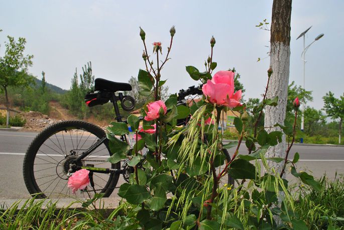 往后走,风真的成西北风了。有多大啊那风,本来下坡的路骑着单车平时的话应该是飕飕的,可逆风里再也找不到那赶脚了。因逆风和上坡变速换低档,脚蹬频率增加,风中感到膝盖韧带出奇的疼,最后疼的休息了好几次,在这里赏着花,等着弟兄开车来拉我了。回到弟兄的单位,准备出去啃大骨头喝羊肉汤,吃煎饼大葱!这时还不是很敢站,感不到累,就是膝盖疼。中午喝了好多啤酒,多多的爱心传递完成,总算可以轻松了。