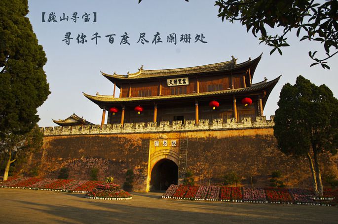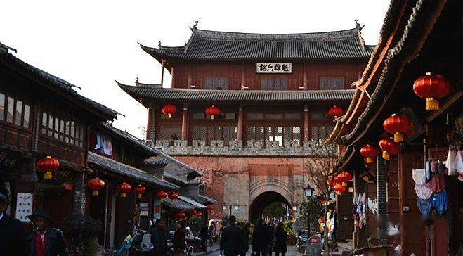 吃完又来到拱辰楼,为明代蒙化府北门城楼,始建于明洪武22年。原为三重檐城楼,永历4年改为两层。现楼重歇山顶,面阔5间28米,进深17米,高16米,建于高8.5米的城廊上,登楼可俯视全城,整体建筑古朴浑厚。楼阁南侧悬“雄魁六诏”匾额,为清乾隆三十六年蒙化府同知康勤所书,北侧则悬“万里瞻天”匾,乾隆50年,蒙化直隶厅同知黄大鹤书,二匾书法气势磅礴,浑厚有力,1993年公布为云南省文物保护单位。