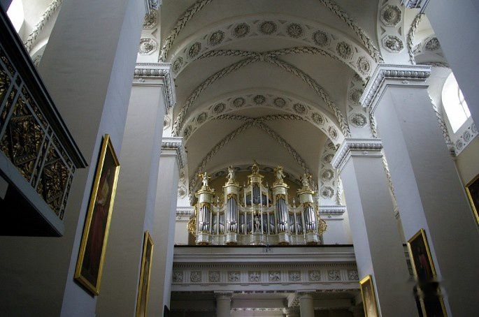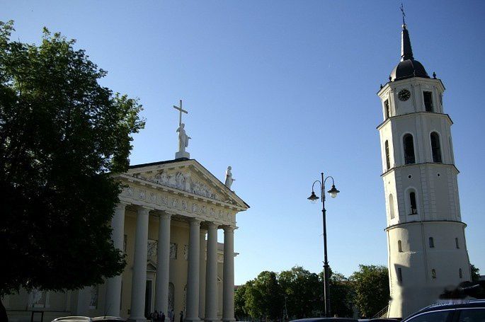 维尔纽斯大教堂位于老城格季米纳斯山下,建于14世纪末。 白色的山墙上立着三尊圣像(中间手举十字架的是圣安娜),旁边是52米高的钟楼(曾为城堡的了望塔),整个教堂十分恢弘,是立陶宛天主教徒心目中的圣殿。
