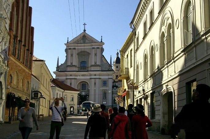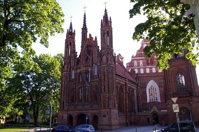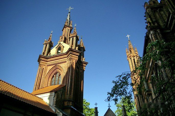 维尔纽斯旧城素有“教堂之城”之称,我们接下来游览的还是教堂——圣安娜教堂(天主教)及修道院。教堂是立陶宛大公爵为其夫人Anna而建,全部用红砖砌成,仅外墙就用了33种不同形状的砖。整个教堂布局均匀,色调和谐,像由线条和角塔构成绚丽多资的图案,极为壮观。据说,拿破仑东征至此,感叹其美丽,曾想把它迁到巴黎与圣母院并列放置。