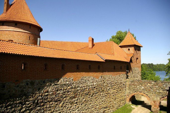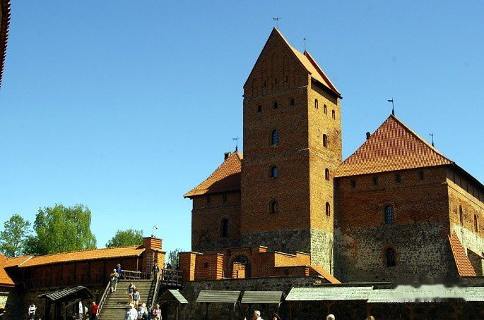 立陶宛大公国大公曾在此居住(14-16世纪),是当时的政治中心,也是军事要地。17世纪以来,由于长年战乱渐渐荒废,直到上世纪中叶修复重建。城堡由粉红色的砖石砌成,远观之,浮于水面之上,非常美丽,近观之,不做任何修饰,原始朴质。整个城堡面积不大,但城墙十分坚厚,城堡四周建有中世纪骑士风格的圆锥尖顶瞭望塔瞭望台。