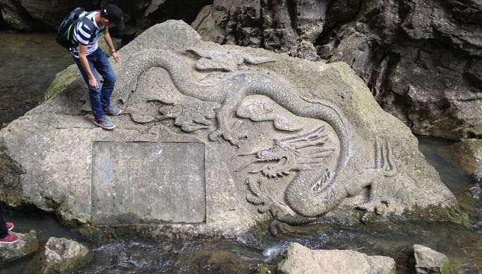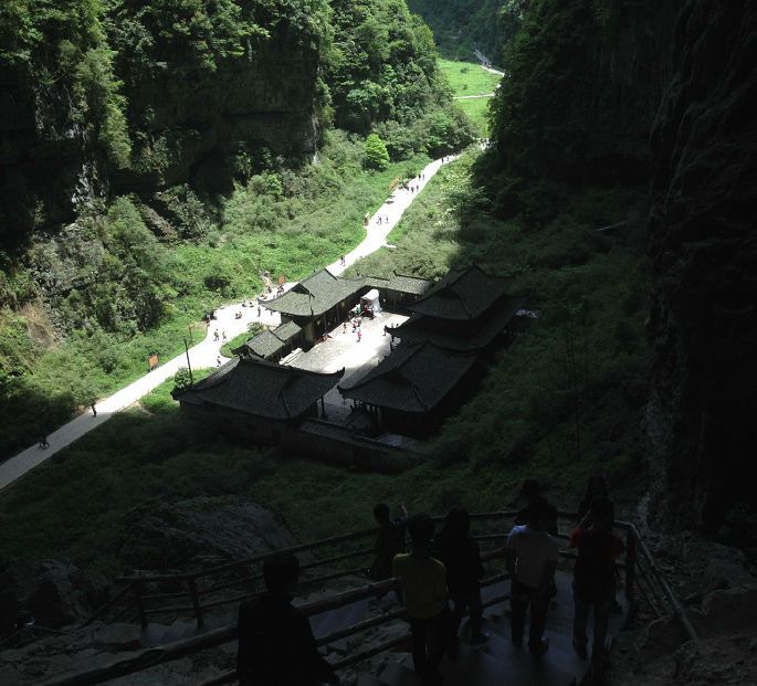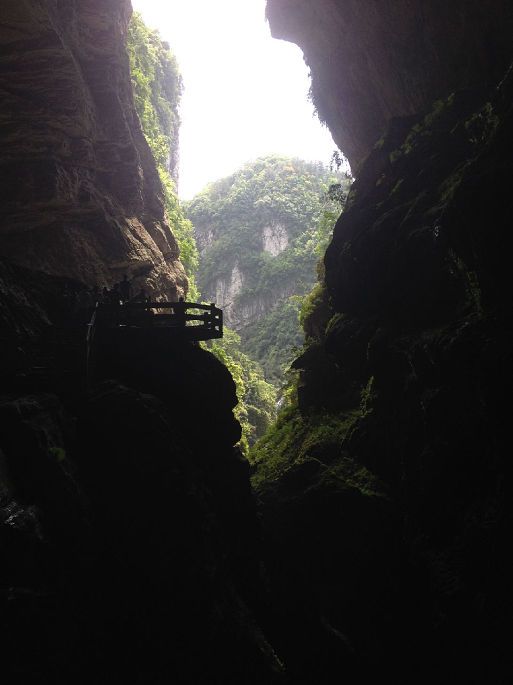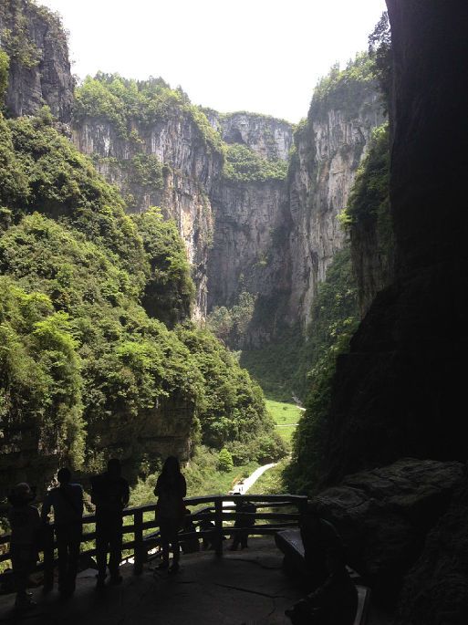 中午回到游客接待中心,买票去看天生三桥和龙水峡地缝。这两个景点是接着的,第一个景点天生三桥看完之后要爬一段台阶,景区有小车子可以送到第二个景点售票处,费用是15元。我个人觉得没必要浪费,几个小伙子一起走上去就可以了,最多十分钟就到了。