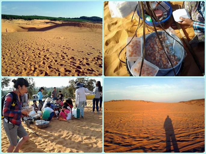 红沙丘就在海边。晨曦下,红色的沙丘更显火热,成群的越南小朋友拿着滑板,期待着游人租来滑沙。丘顶上不少小吃,生意很旺。是否知道看日出的人一早出门,现在想吃点什么了。