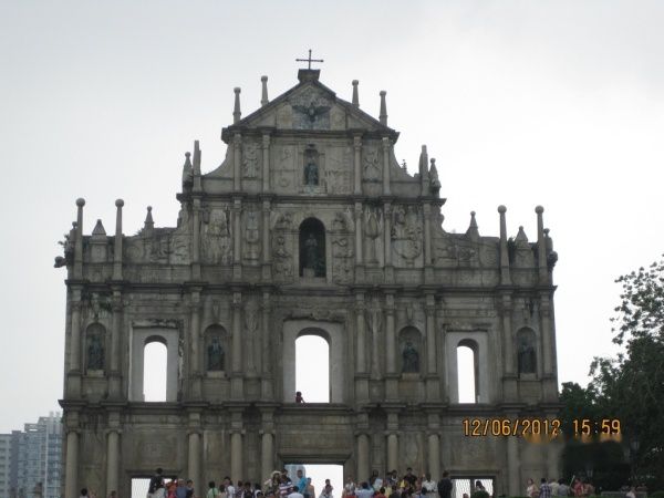 大三巴牌坊即圣保罗教堂的前壁遗迹,位于澳门大巴街附近的小山丘上。已有350多年历史,整座教堂体现了欧洲文艺复兴时期建筑风格与东方建筑特色的结合,是当时东方最大的天主教堂。而仅存的这前壁部分是当年大火烧剩残存的,因为它的形状与中国传统牌坊相似,所以取名为“大三巴牌坊”。精美绝伦的艺术雕刻,将大三巴牌坊装饰得古朴典雅。无论是牌坊顶端高耸的十字架,还是铜鸽下面的圣婴雕像和被天使、鲜花环绕的圣母塑像,都充满着浓郁的宗教气氛,流连期间真是一种别有风味的美的享受。