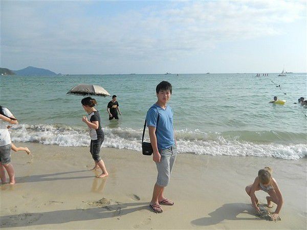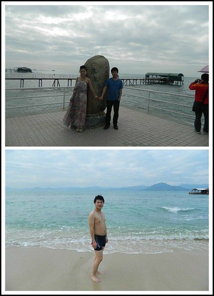 D5:这一天还是报团去了皇后湾,但是那一天实在是太悲惨了,风大,有穿的很单薄,重要的是那里实在是太????一般了,虽然有免费的香蕉船、水上自行车、还有很深潜。我觉得是我来的那几天太享受了,最后这两天实在是太悲惨了,我和S骑水上自行车,因为浪大,所以飘得很远,凭最倒霉的是骑到离我们的穿很远的地方的时候,链子居然断了,在海上我们又不能自己去修,又不能随便乱动,所以我向我们船招手求助,结果?????他们也只是向我们挥手!完全不知道我们的处境,我们喊,链子断了,来救我们之类的,得到的回应是”开饭了,快回来!!“我和S顿时泪奔!!!!最后还是玩别的项目的人,开船修好后我们蹬回去的。!到了深潜因为是免费的,所以忍着冷飕飕海风,跳下水。那人问我们要不要照相,想了想就照了。回去后,我根本分不清楚哪个是我哪个是S。 当然照片是要收费的 一个人200似乎!!