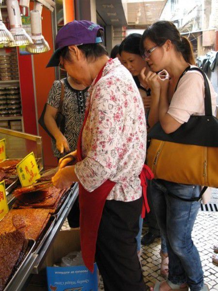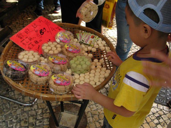 然后往上走一路也是店铺,快到大三巴的时候,人变得多起来了。手信街就在这里了。免费试吃可是名不虚传的哦。