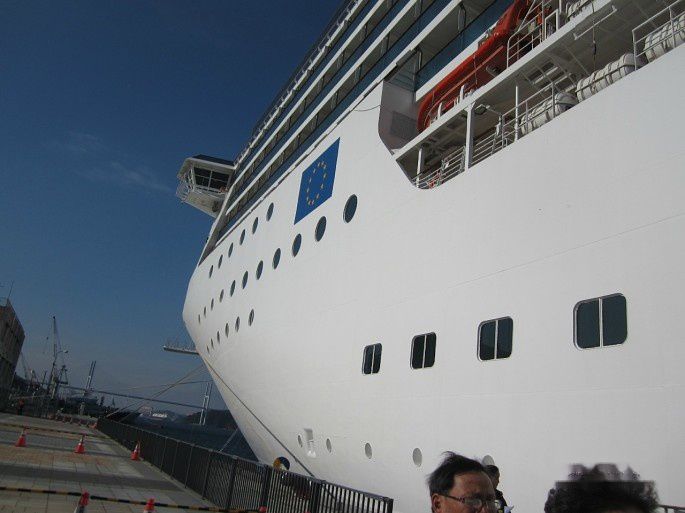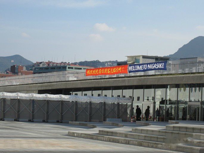 先左左右右拍拍我们自己的船,在上海港口出发的时候没机会这么近距离拍过船。然后再拍拍入境口岸大厅上面的横幅,用英语和中文写着:热烈欢迎各位游客光临长崎!