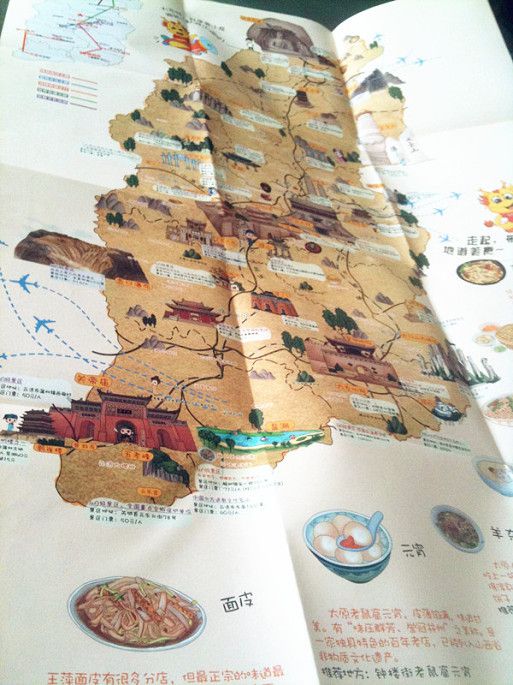 到达太原武宿机场后看得到了一份非常有意思的旅游攻略。里面有一副大大的山西地图,标注卡通童趣,还包含了许多山西特产,卡哇伊呀~