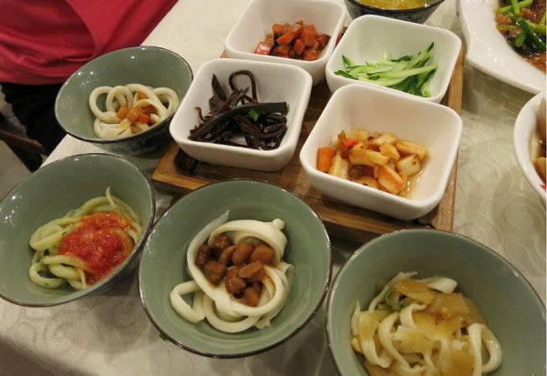 最后说说古城的吃,古城名吃就那么几种,平遥牛肉、碗托(也有叫碗秃则、碗秃的,据我目测,好像都是一种东西。吃法有凉拌、炒等)、莜面栲栳栳、各种形状的面条。我们吃过的,德居源、云锦成、还有在县衙听雨楼旁边一个小店的,要我说,环境最好的是云锦成,也是价格最高的。但是让我觉得好吃的反而是县衙旁边的小店,里面贴满了花花绿绿的纸,都是客人写上感触留下的,这里价格也公道实惠,莜面圪扦扦可以试试哦,下面一会放图。不过吃了N顿莜面后,作为一个可耻的居然不爱吃面的北方人,我还是抛弃了面食,选择了一顿西式简餐,在樱花屋,价格也还可以,味道大众口味吧。