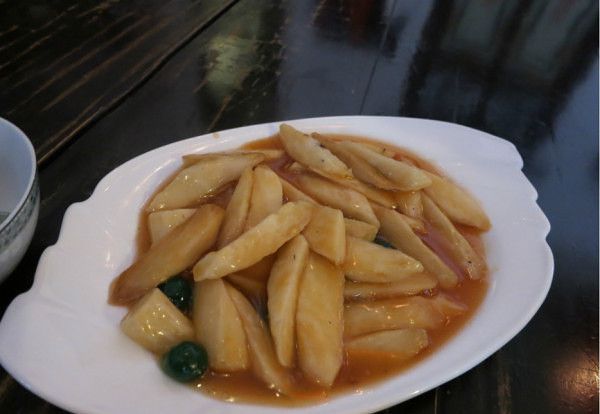 下图为蜜汁长山药。忘了说了,长山药也是平遥特产,做法无非是蜜汁或者拔丝。这个蜜汁感觉像糖醋味的,也许拔丝更合适些。
