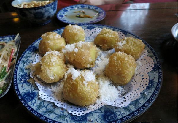 下图为我忘了说的一道小吃,泡泡油糕。有点像炸糕和北京的奶油炸糕。外面是黄米面和江米面吧,反正是黏黏的感觉,里面塞的是枣泥馅或者豆沙馅。