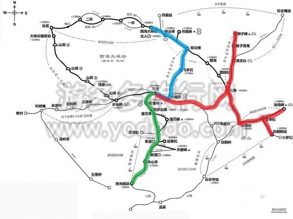 我选择的黄山路线是反季节反常规,从未开放索道的慈光阁上,直接爬到白云宾馆(绿色线);短暂休整后直奔排云亭看日落,原路回白云宾馆(蓝色线);第二天早起光明顶看日出,结束后直奔狮子峰,再从狮子峰到始信峰,然后从白鹅岭新站坐索道下来。走得有点赶是希望泡两小时温泉能赶上云宏村的大巴,结果淡季的最后一班是1点40的,后面一班不开了,非常郁闷。