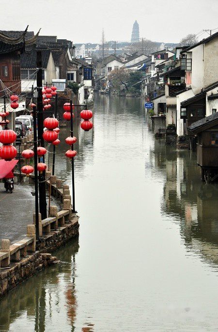 山塘街的水陆两道都连着虎丘,这是在当日起始点星桥上拍下的山塘河景色,远景中望见了虎丘塔