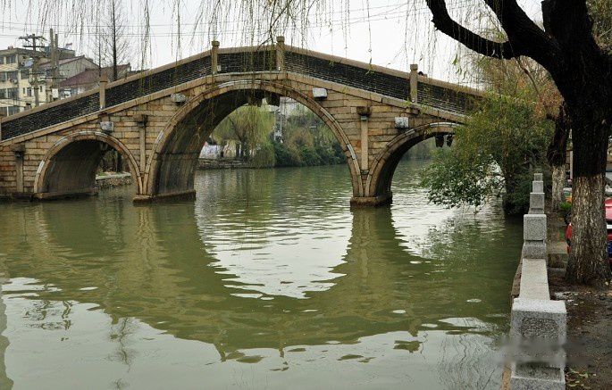 横跨山塘河上的普济桥,是苏州市区仅存的三孔石拱桥。该桥建于清康熙四十九年(1710年),历经乾隆、道光、同治年间和民国时期重修。全桥以花岗石构筑,栏板以青砖砌成,以长条石压顶。