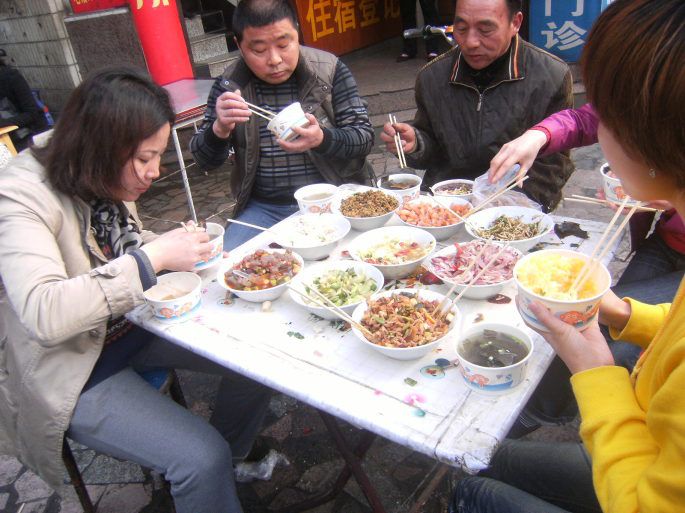 5日晨起,阳光照人。在主旁边市场用早餐,饭馆、早餐摊、青菜水果什么的,蛮丰富。见有几个人围坐着同吃,桌上几碗菜,还真没见过。