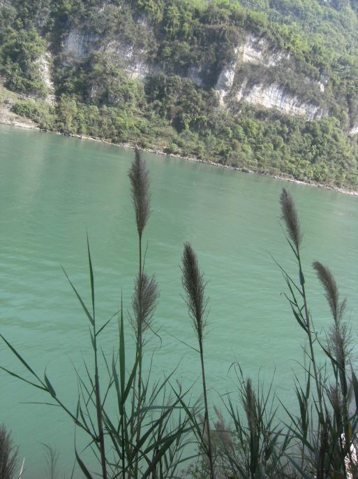 出龙进溪,沿江边行,见有拉纤、图腾崇拜雕塑。几株芦苇迎着江水青山,生的力量。