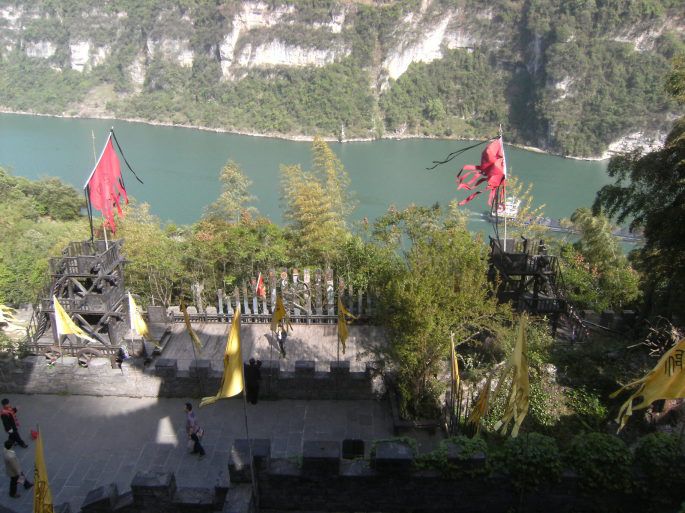 峡水青绿,风吹到脸上,凉凉的。船行不久,到了码头。正逢表演节目,还有炮声,船只升帆,但没搞懂呵~~~水中红衣女撑伞造型,旁有弄笛人,造型还美。