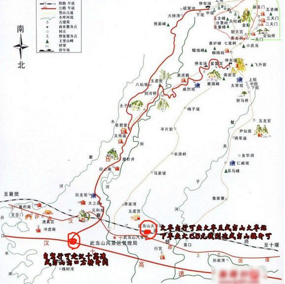 武当山的地图,二年前的了,不过还是喜欢这个版本的,一是景点标的很清晰,二是线路划分的比较明显。右上角橙色圈起来的部分为明代山道,绿色圈起来的部分为清代山道。