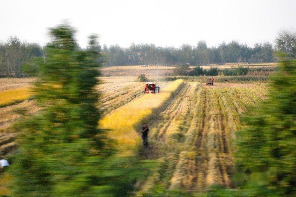 正值农忙时分,车窗外一片金色的稻田正逢收获的喜悦。