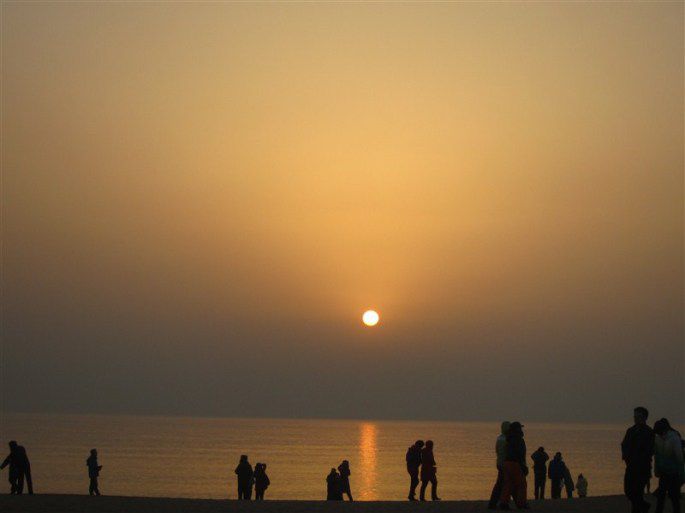 次日一早,到海边玩。起的晚了太阳已经出来了错过了日出!看着大海,我们的心胸似乎也变得开阔了.在这种境界里,使人神清气爽,心旷神怡.海水涨潮了,海水中的波浪一个连着一个向岸边涌来。天空上也是皎洁无比的蔚蓝色,只有几片薄纱似的轻云。平贴于空中,就如一个女郎,穿上了绝美的蓝色夏衣,而颈间却围绕了一段绝细绝轻的白纱巾。我从没见过那么美的海天。
