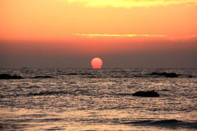 到海边找一块干净的沙滩坐下,望着大海远处,天空变成了浅蓝色,很浅很浅的;转眼间天边出现了一道红霞,慢慢儿扩大了它的范围,加强了它的光亮。我知道太阳要从那天际升起来了,便目不转睛地望着那里。果然,过了一会儿,在那里就出现了太阳的一小半,红是红得很,却没有光亮。这太阳像负着什么重担似的,慢慢儿一步一步地、努力向上面升起来,到了最后,终于冲破了云霞完全跳出了海面。那颜色真红得可爱。一刹那间,这深红的东西,忽然发出了夺目的光亮,射得人眼睛发痛,同时附近的云也着了光彩。