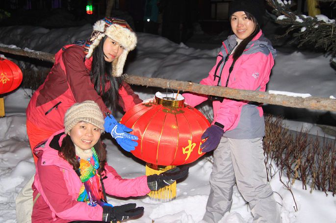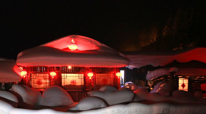 夜晚大红灯笼高高挂、白白的雪映着红色的灯笼,整个村庄透露着喜庆、很有过年的气氛![]()