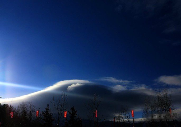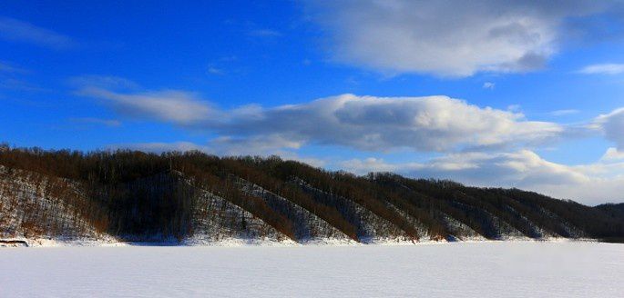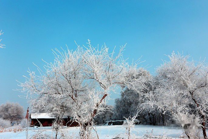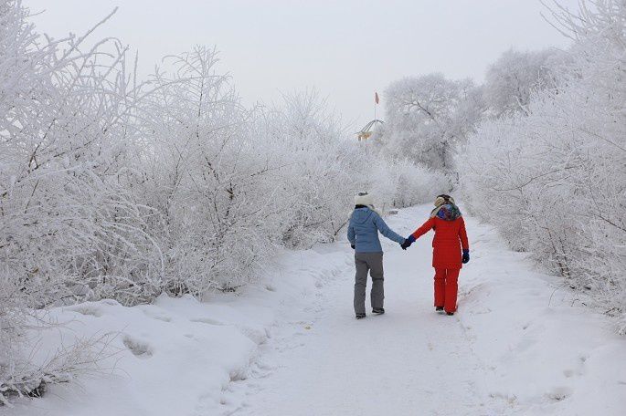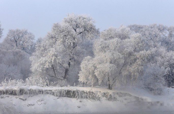 冬日里不冻的江水腾起来的水雾,遇到寒冷的空气,在树上凝结为霜花,气象学称之为“雾淞”。沿着松花江的堤岸望去,松柳凝霜挂雪,戴玉披银,如朵朵白云,排排雪浪,十分壮观...