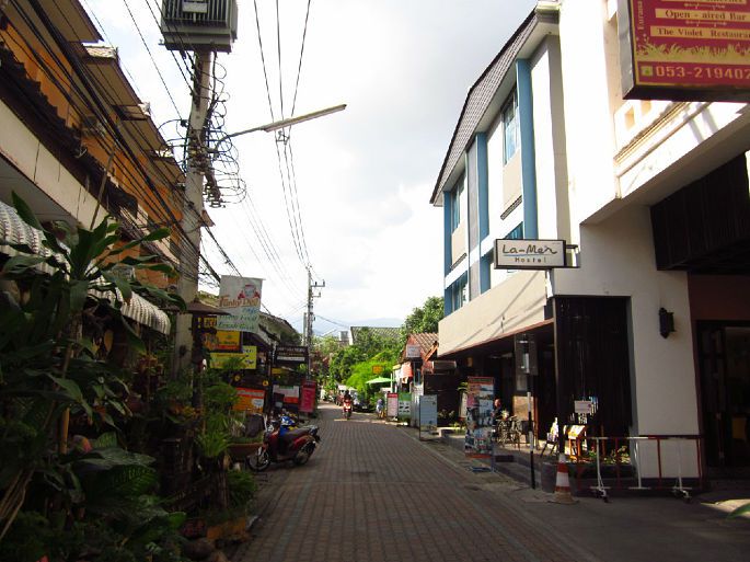 我们乘坐的汽车早上9:30从素可泰出发, 下午大约3点到达清迈(Chiangmai)Bus Ternimal 1. 由于没有预定旅馆, 下车后便打一嘟嘟车到客棧相对集中的老城东门塔佩门(Tha Pae Gate)附近慢慢的找住处. 可能是这一带位置好的关系, 连问了几家都说客满, 在Chiang Mai White House他们说只剩一间三人房, 还是只能住一晚, 因为第二天的已被预定了. 初来乍到人生地不熟, 已是下午四点了, 一路鞍马老顿还带着行李, 怕一犹豫这个房间也被别人定走, 于是先住下来慢慢再找其他旅馆吧. 对房间感觉不怎么满意, 尤其卫生方面实在不敢恭维. 价格550TB/晚.