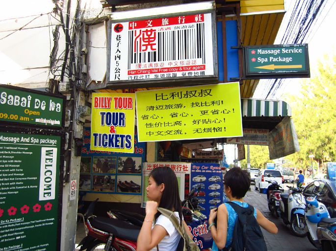 塔佩门(Tha Pae Gate)北面不远处的这家比利叔叔旅行社, 可能是清迈唯一一家自己标榜的中文旅行社. 老板娘是从美斯乐下来的当年国民党部队的后人, 不但中文说的好, 给的价格相对也便宜点, 而且所在位置也不错. 因为原来有去美斯乐的想法, 借机咨询了一下老板娘, 由于交通不便时间又紧, 算来算去这个行程不好安排, 才取消了这个计划. 最后定了19号去清莱金三角一日游的配套, 价格是1000TB/人. 之后回旅馆休息, 计划傍晚时去清迈夜市逛逛.
