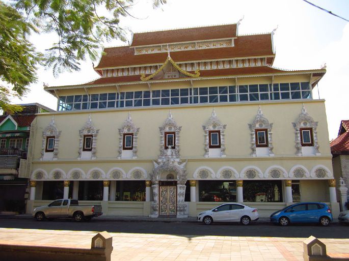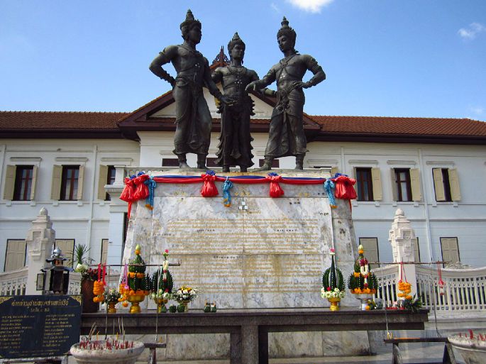 三王像后面的那栋建筑就是清迈艺术文化中心, 这座博物馆的建筑物建于1924年,有展示清迈的历史资料、清迈人古今生活、清迈佛教文化、农业及山地民族资料等。位于文化中心的正前方,是著名的三王雕像,三位对清迈有重大贡献的人物:兰甘亨大帝, 孟莱王和南蒙王并立,常有当地人在雕像前烧香献花,以示尊敬。