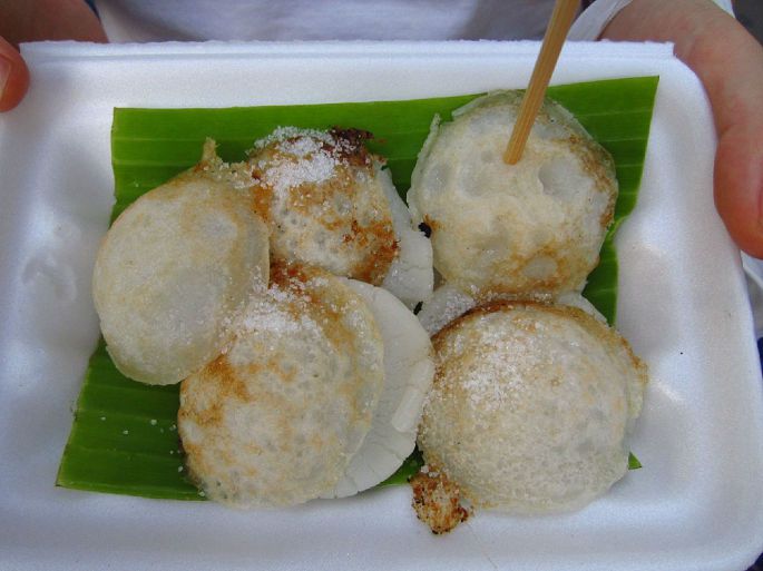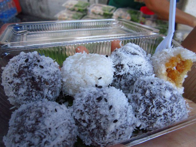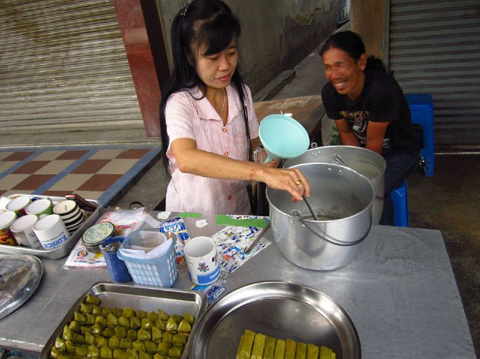 这些日子几乎每天早晨都来这里买早餐. 摊位很小, 只卖早餐, 一般只有粽子, 油条和豆浆. 粽子和油条做的如工艺品般的精小别致, 让人不忍心下口. 纤弱的老板娘温和细致, 把个小食滩打理的干干净净. 每次来还没到摊位前便听到她那泰语唱歌一样的问候声. 食物不仅精美可口, 干净卫生, 价格也很便宜. 我们每天三人的早餐总共基本上不超过50TB(RMB10). 今天逛完附近的古城墙和护城河, 顺道过来买了35TB的早餐并道别.