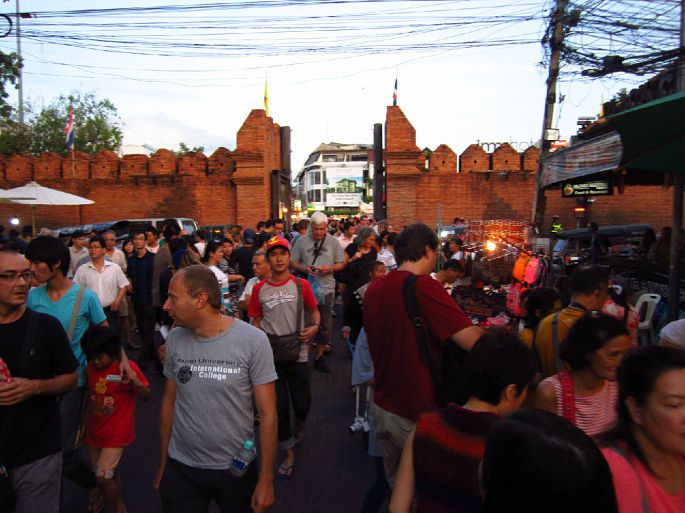 夜幕降临下的塔佩门和清迈周末市场渐渐拥挤起来的人群