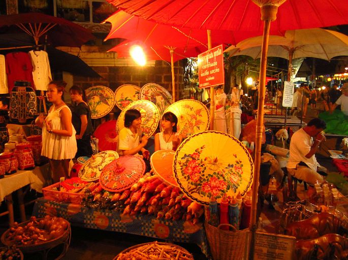 清迈夜市(Chiang Mai Night Bazaar)在清迈古城东面靠近冰河(Ping River)处昌康路(Chang Khlang Rd.)上。清迈最热闹的地方,原只是昌康路的一群摊贩,因附近旅馆林立,得地利之便,现已成为固定上有棚架、路边摊贩云集的夜市,贩售各式各样的廉价品,每天晚上都有,从日落到晚间 11 点。大部分的当地特产都可在这儿买到,如木雕、漆器、银器、古董、香肠、各式服饰、水果和点心,一应俱全。但因周六夜市、周日夜市及其他夜 市的兴起,近年Night Bazaar已盛况不如从前,本地人较少前往。