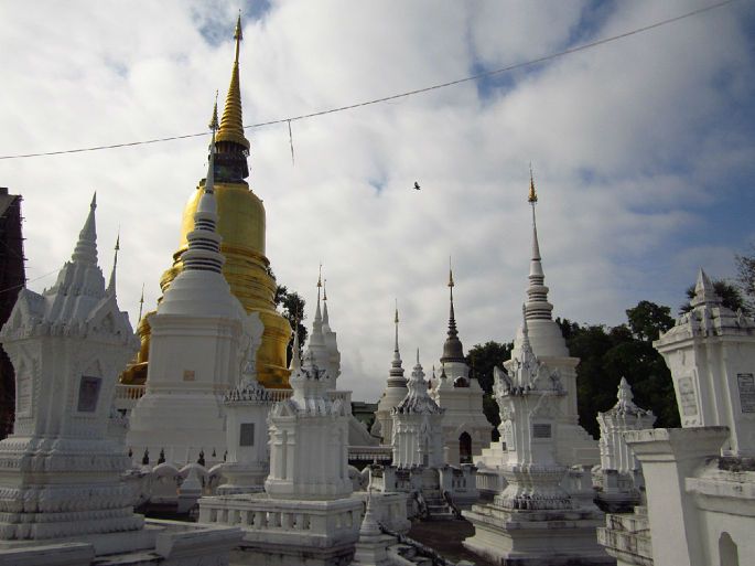 松达寺Wat Suan Duk泰文意思是“花园寺”。位于清迈古城外西边,建于公元1373年,原本是为佛学大师素玛那泰拉(Phra Sumana Thera)雨季时的居所,后曾成为纳兰泰王朝的“御花园”,传说在松达寺的最大佛塔下埋了佛舍利子,而每个超过一人高的白色塔林亦是纳兰泰王室过世后埋葬处。此寺有一座建于16世纪的青铜佛像,每年4月清迈泼水节的主要仪式都会在该寺举行。