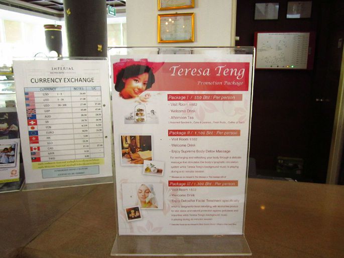 大帝湄滨酒店服务柜台上摆放着参观邓丽君住过的1502房间的内容简介及价格
