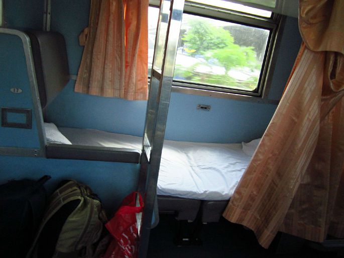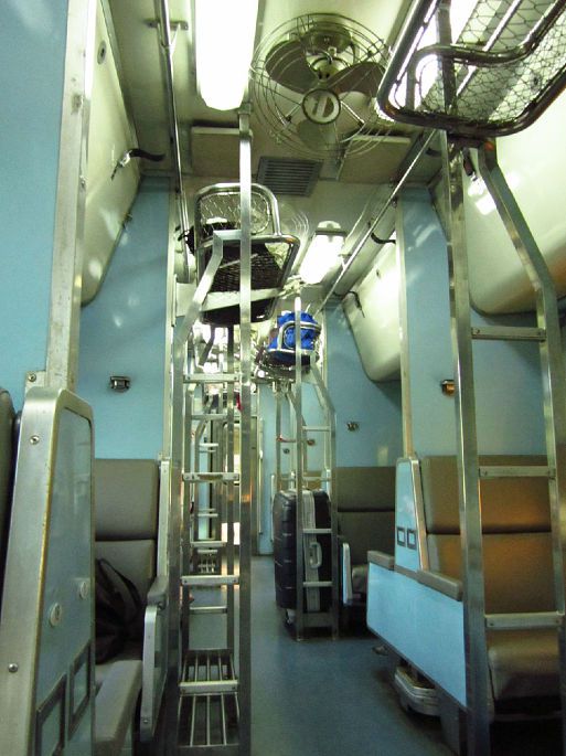 火车上卧铺分两层, 相对的两排座位放倒后便是下层卧铺, 上层平时反转贴放在火车壁上, 用时拉下来便可. 大约晚上七点, 列车员帮忙整理好每位乘客的卧铺. 我们乘坐的这趟在世界背包客群体里颇有名气的东方快车, 载着满员的旅客, 渐渐远离古城清迈奔向曼谷.