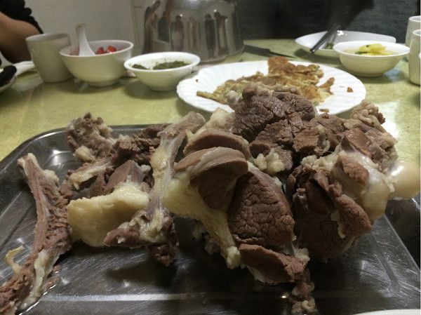 很多莫名而来的客人或者当地人,去的时候要等位。麻酱特别好吃,价格合适。手扒肉就是把羊按关节带骨割成很多块,放到不加盐不加任何作料的白水锅里面煮,只要肉变色就可以吃啦。这种做法是真正看羊肉质量怎么样的做法。我们中午去已经是第4只羊了,自己选肉。