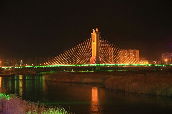 这座大桥投资总额近2.4亿元是 内蒙古自治区第一座大跨度、双索面独塔斜拉桥——哈萨尔大桥暨哈萨尔大街。