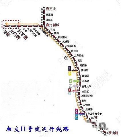轨道交通11号线由主线和支线两条线路构成。主线从嘉定北站至浦东罗山路站,单线里程约65公里,途经嘉定区、普陀区、长宁区、徐汇区和浦东新区,目前轨交11号线与其它轨交线路的换乘站点分别设在曹杨路站(换乘3# 和4# 线)、江苏路站(换乘2# 线)、交通大学站(换乘10# 线)、徐家汇站(换乘1# 和9# 线)、东方体育中心站(换乘6# 和 8# 线 )、罗山路站(换乘16# 线)。支线由江苏昆山的花桥站至嘉定新城站,并与主线段在嘉定新城站并线,单线全程达到72公里,是国内单线里程最长的轨交线路,也是全国首条跨省轨道交通。