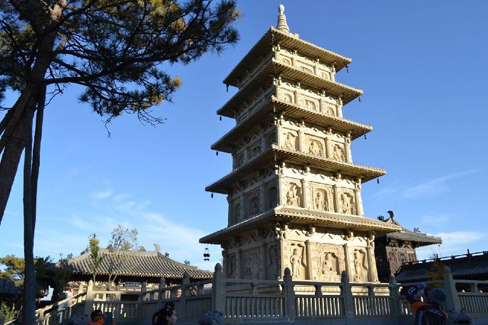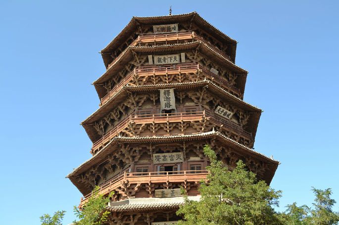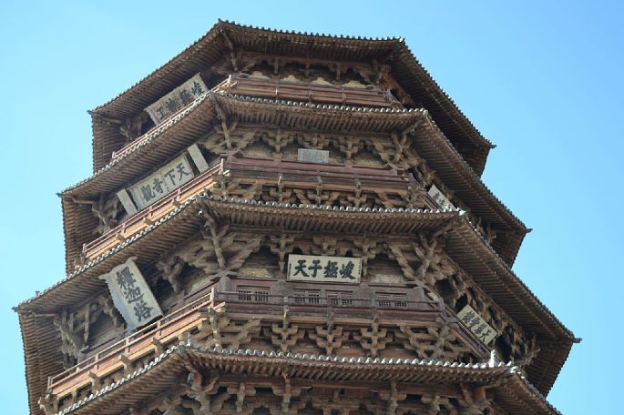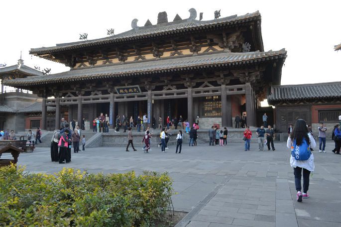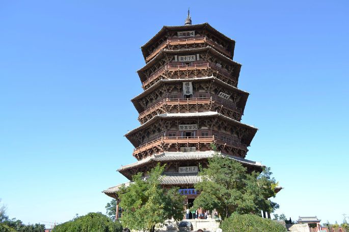 清晨八点半钟,从太原出发,参考机场里拿的免费地图,道路,门票价格都有,十分详细,随便沿途欣赏山西的美景,中午十二点到达应县。应县木塔,位于山西省朔州市应县城内西北角,在我们北上太原的途中。它是中国现存最早的木结构楼阁式高层建筑,中国独一,举世无双。为中国重点文物保护单位。木塔建于辽清宁二年(1056年),即北宋至和三年。塔高67.31米,底层直径30.27米。木塔在 设计和施工上匠心独具,塔身为楼阁式,平面为八角形,外形五层云檐。各明层间夹设暗层,实为九层。结构上采用双层环形套筒空间框架。全塔没有一个铁钉子, 全靠构件互相铆榫咬合。全塔共使用54种不同形式的斗拱,种类之多,国内罕见,被世人称为“斗拱博物馆”。因此,古籍上誉之为“远看擎天柱,近似百尺 莲”。是我国古代建筑中的瑰宝。在建筑技艺上,它与法国的艾非尔铁塔、意大利的比萨斜塔齐名,被世人称为“世界三大奇塔”。