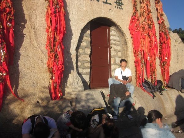 看完日出,就等着师兄回来找我们,等着等着就睡着了0 0睡了一觉师兄还没来,我和fly猜想他肯定在山上睡了,无奈,我们只好继续等待,等得望眼欲穿,终于等来了,吃点食物,继续睡o(╯□╰)o玉女峰上睡倒一大片,此时我已经进入第二天的状态,看得很乐。红彤彤的全是锁和平安带。