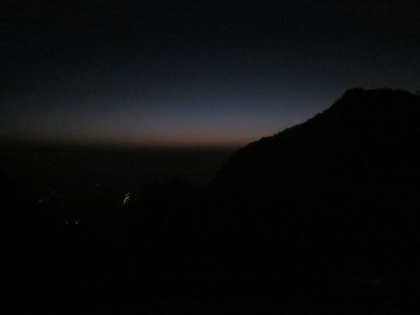 继续记忆缺失,只知道好累好累啊,因为要去看日出,直接跳过北峰,继续爬,爬到一个平台,囧,还是不知道是哪里,已经精疲力竭了,师兄叫了一盒泡面,10块,热水5块,山上都这个价,矿泉水10元3瓶好像- -反正我们带了很多水,有师兄背着。我看到吃的就恶心,被强迫吃了一块巧克力,坐在那里,一阵风吹过,好冷啊- -赶紧穿上外套。这里已经有租大衣的了,我无视它。因为原来爬的大汗淋漓,所以此时的山风吹来显得特别冰寒,继续哆嗦。等师兄泡好面,东方出现了一丝彩霞,我一看才4点30,不是说5点30差不多才日出吗!