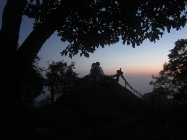可惜我心有余而力不足,事实上我还是继续拖脚后跟,我只好和师兄说,你去吧,我只能慢慢爬上去,爬多少算多少啦。师兄很善良的没有抛弃我,真是感动- -路上看到一对情侣裹着棉被(是棉被吧?看着像)坐在一块石头上看日出,真意境。